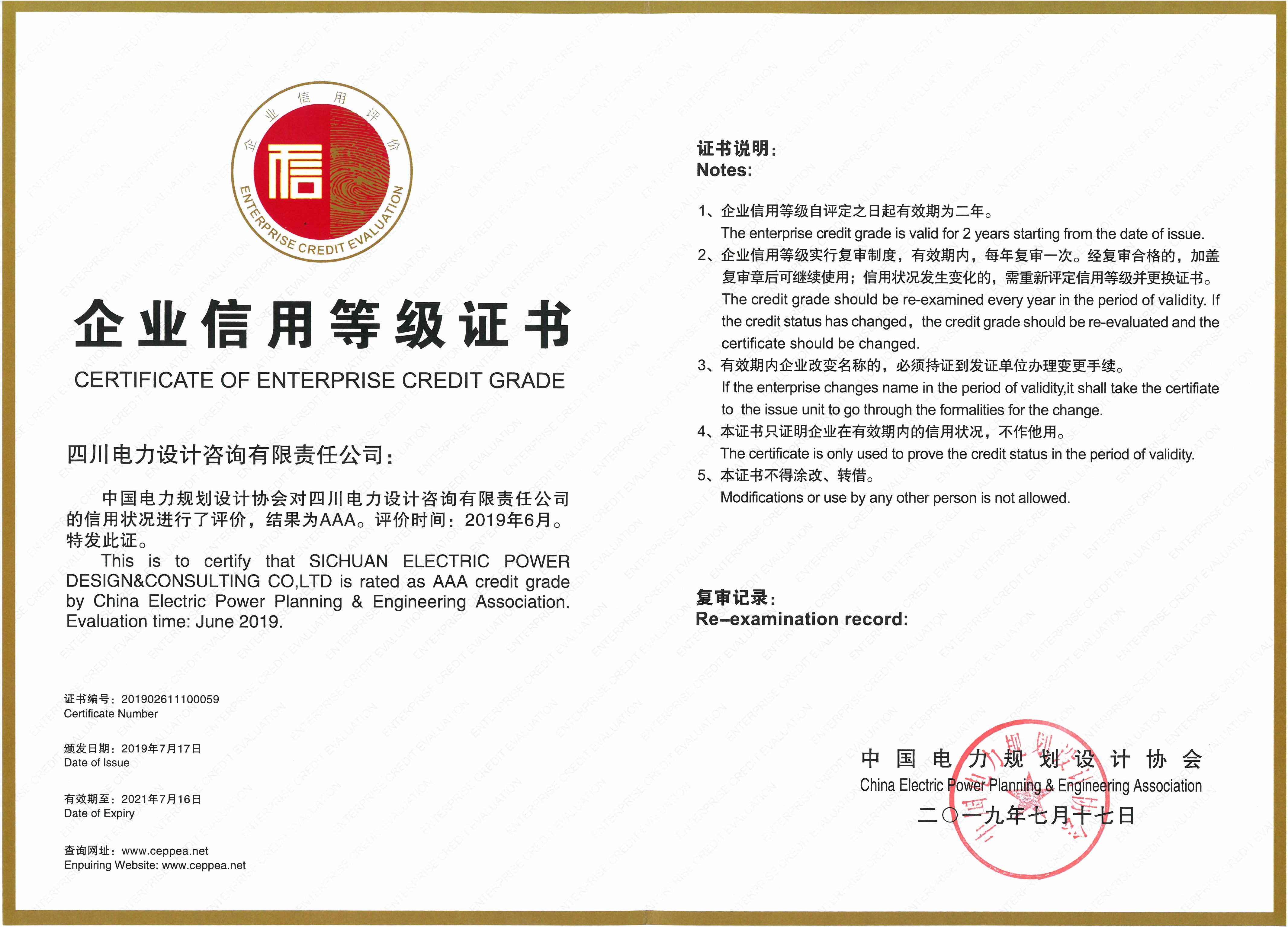 企業信用AAA等級證書(電力規劃協會)